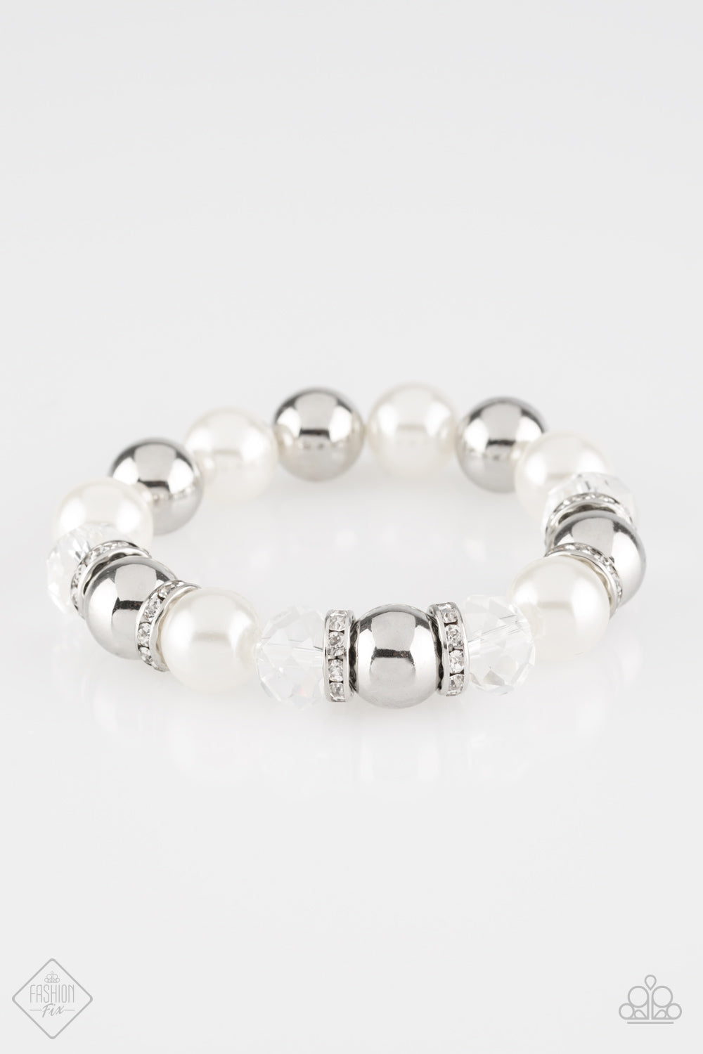 Oversized silver, crystal-like, and pearly white beads are threaded along a stretchy elastic band and wrapped around the wrist for a glamorous look. White rhinestone encrusted rings are sprinkled between the dramatic beads for a sparkling finish.