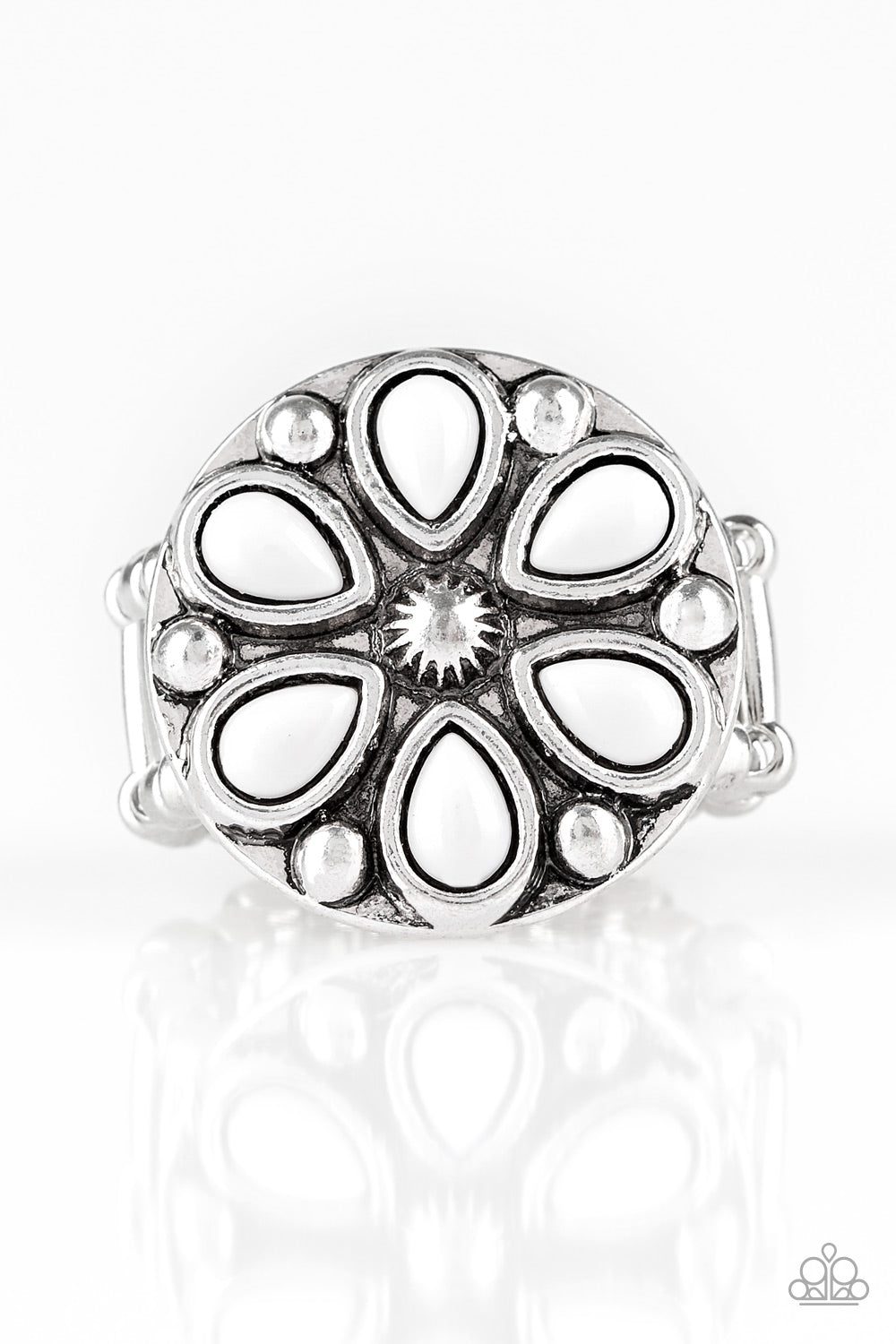 Polished white beads are pressed into a studded silver frame, creating a colorful floral centerpiece atop the finger. Features a stretchy band for a flexible fit.