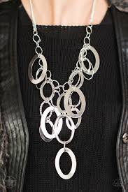 Large silver links and shimmering textured silver rings cascade below a silver chain freely, allowing for movement that makes a bold statement. Features an adjustable clasp closure.