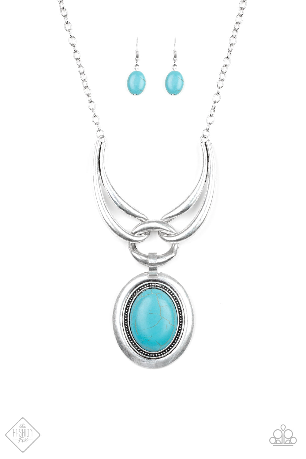 Three handcrafted silver frames connect below the collar in a bold artisan inspired fashion. Nestled in the center of a studded silver frame, an oversized turquoise stone pendant swings from the bottom of the interlocking frames for a dramatic finish. Features an adjustable clasp closure.