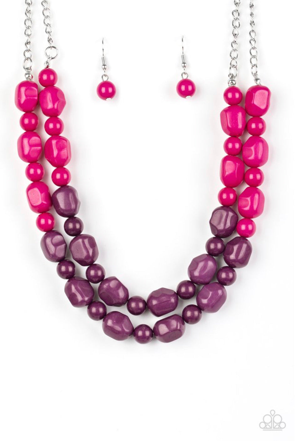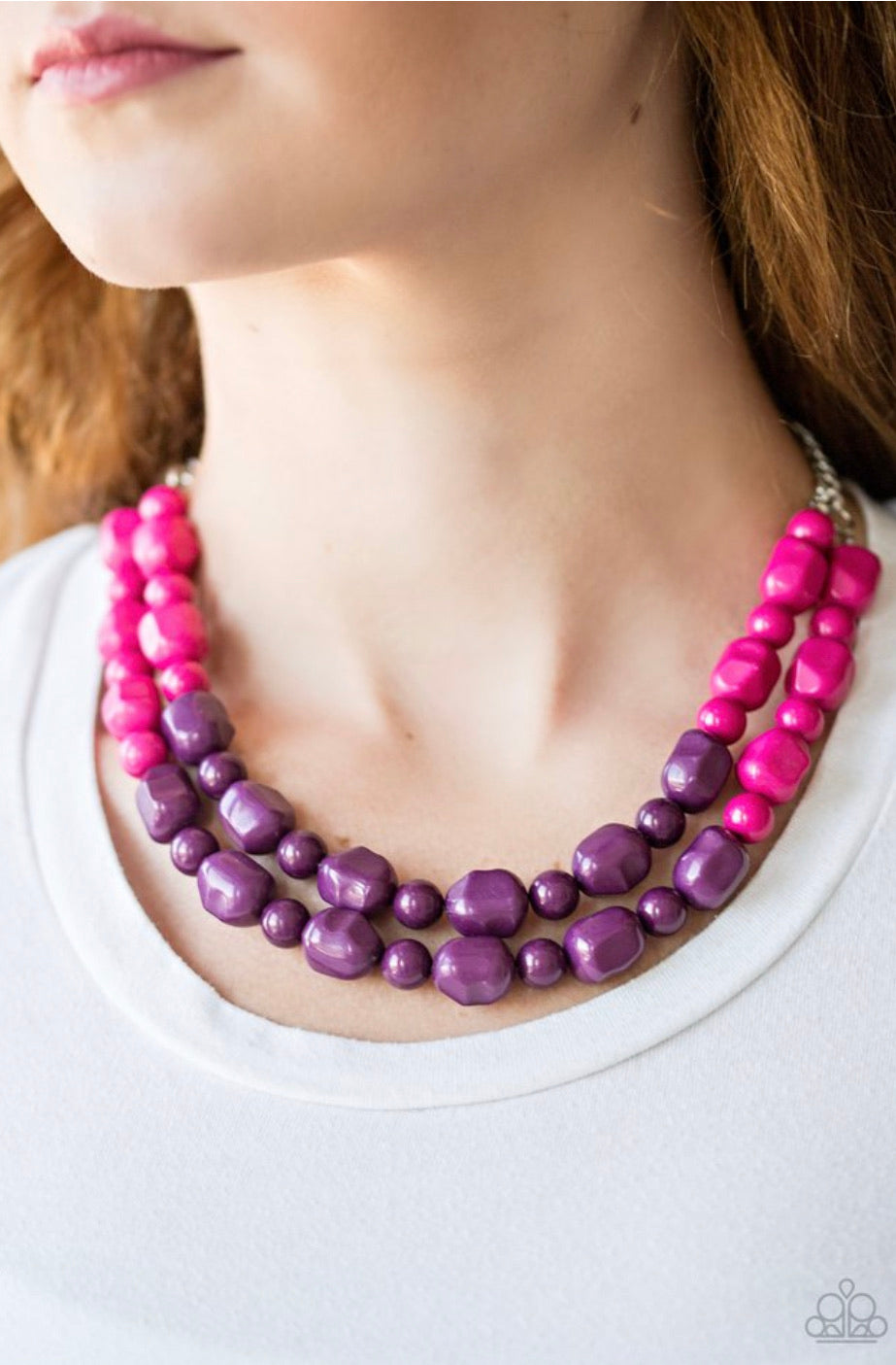 Tiers of round and abstract pink beading give way to purple beading, creating a cascading complementary ombre-effect below the collar. Features an adjustable clasp closure.