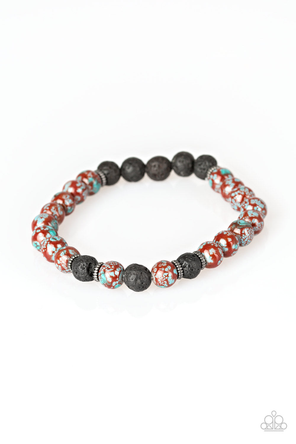 Infused with silver accents, earthy lava rocks and speckled stone beads are threaded along a stretchy band for a seasonal look.
