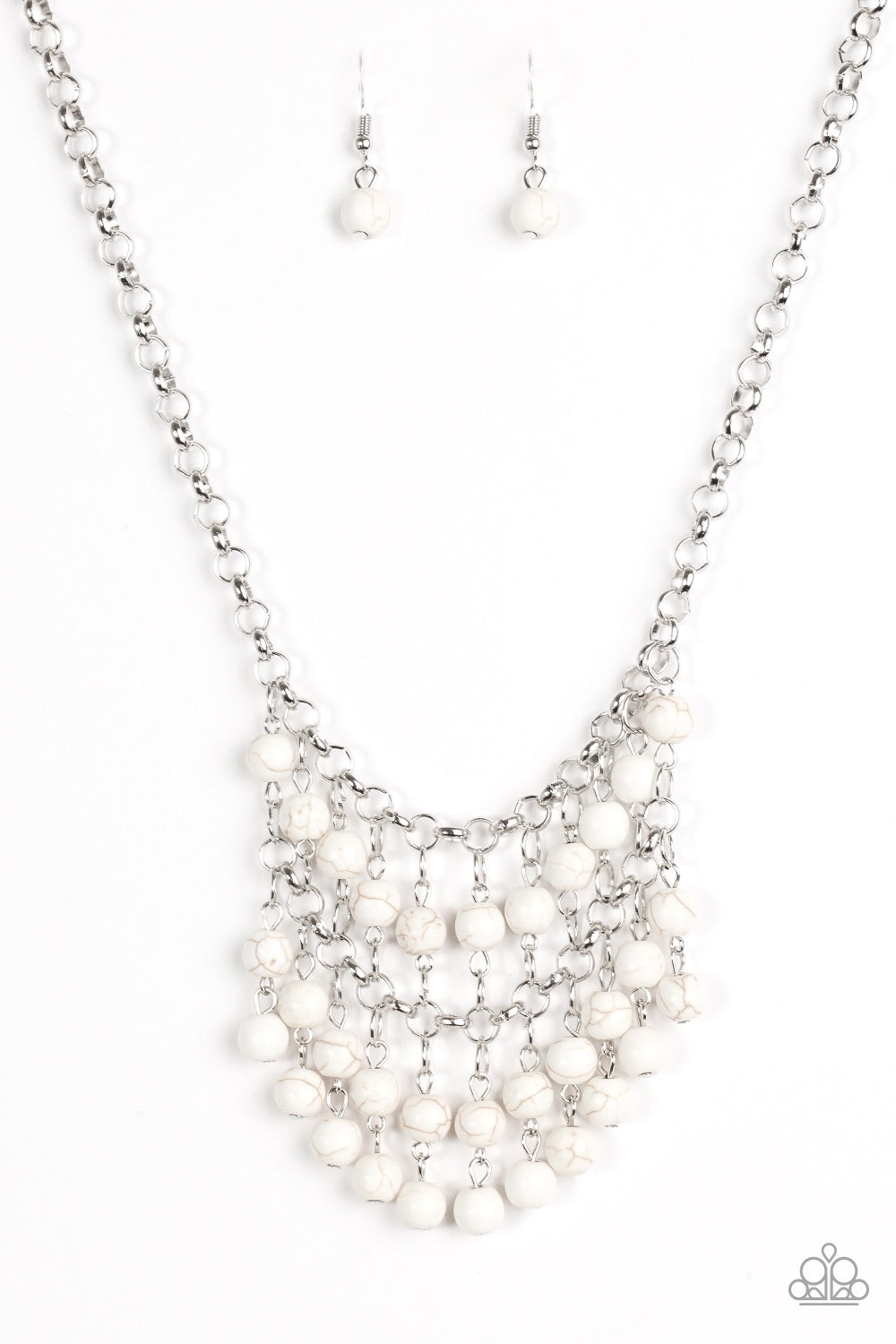 Refreshing white stone beads swing from the bottom of a netted silver chain, creating a bold artisanal fringe below the collar. Features an adjustable clasp closure.