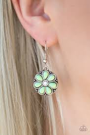 Refreshing green beads spin around a white beaded center, creating a whimsical daisy pattern for a seasonal fashion. Earring attaches to a standard fishhook fitting.