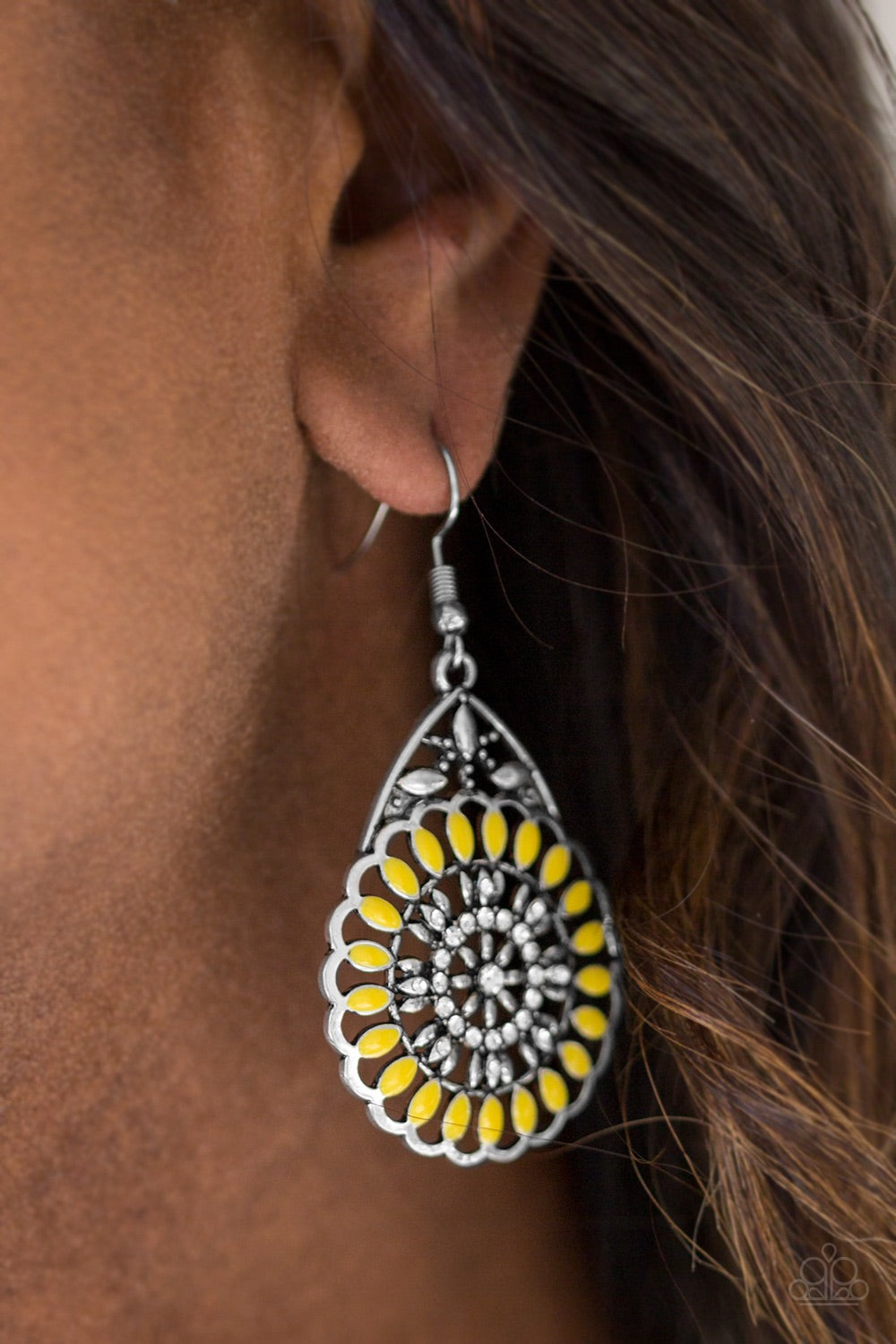 Painted in a sunny hue, colorful yellow petals flare out from a white rhinestone encrusted center, creating a summery lure. Earring attaches to a standard fishhook fitting.