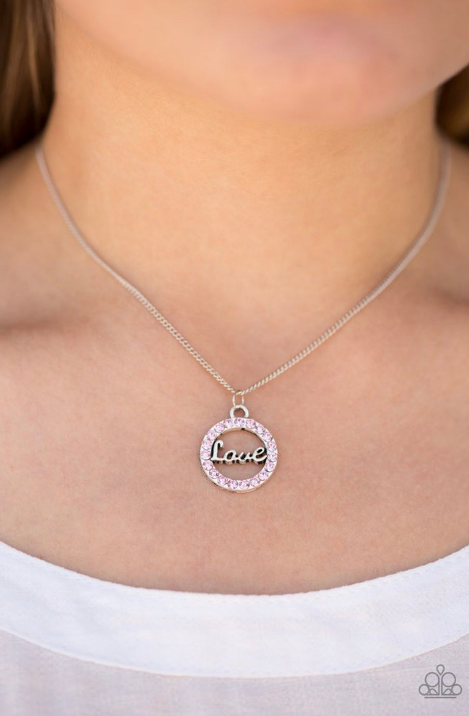 The word “love” is spelled out across the center of a silver circle, creating an airy pendant below the collar. Glittery pink rhinestones are encrusted along the frame, adding a sparkling finish to the romantic palette. Features an adjustable clasp closure.