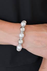A collection of white rhinestone encrusted rings, silver pearls, and classic silver beads are threaded along a stretchy band around the wrist for a glamorous look.
