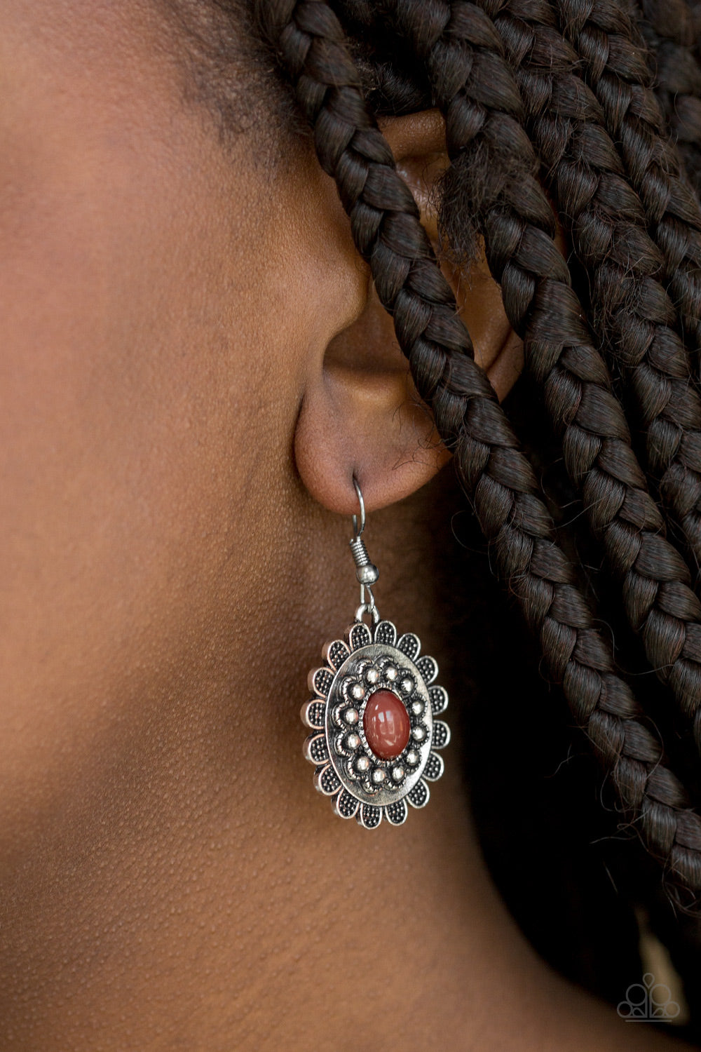 A robust brown bead is pressed into the center of an ornate floral frame for a summery look. Earring attaches to a standard fishhook fitting.