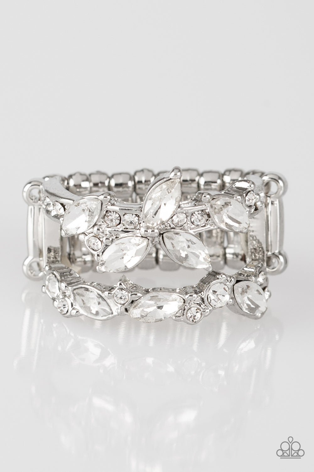 Featuring round and regal marquise style cuts, glittery white rhinestones stack across the finger in two glittery bands. Features a stretchy band for a flexible fit.