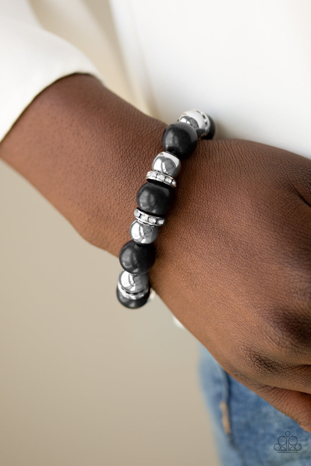 Bracelet-Faux black stones, shiny silver beads, and white rhinestone encrusted rings are threaded along a stretchy band and wrapped around the wrist for a refined look.