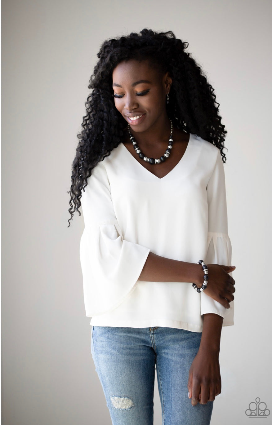Necklace-A collection of faux black stones, shiny silver beads, and white rhinestone encrusted rings join below the collar in a refined fashion. Features an adjustable clasp closure.