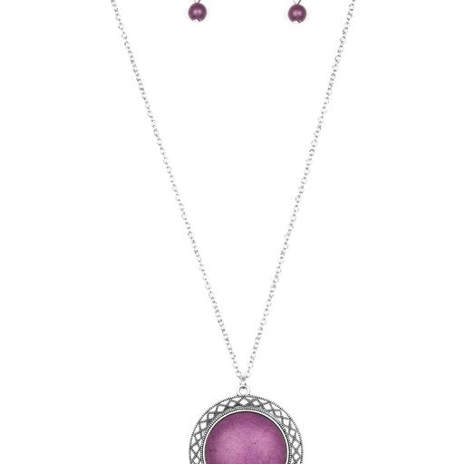 A vivacious purple stone is pressed into the center of a shimmery silver frame radiating with sunburst details. The earthy frame swings from the bottom of a lengthened silver chain for a seasonal finish. Features an adjustable clasp closure.