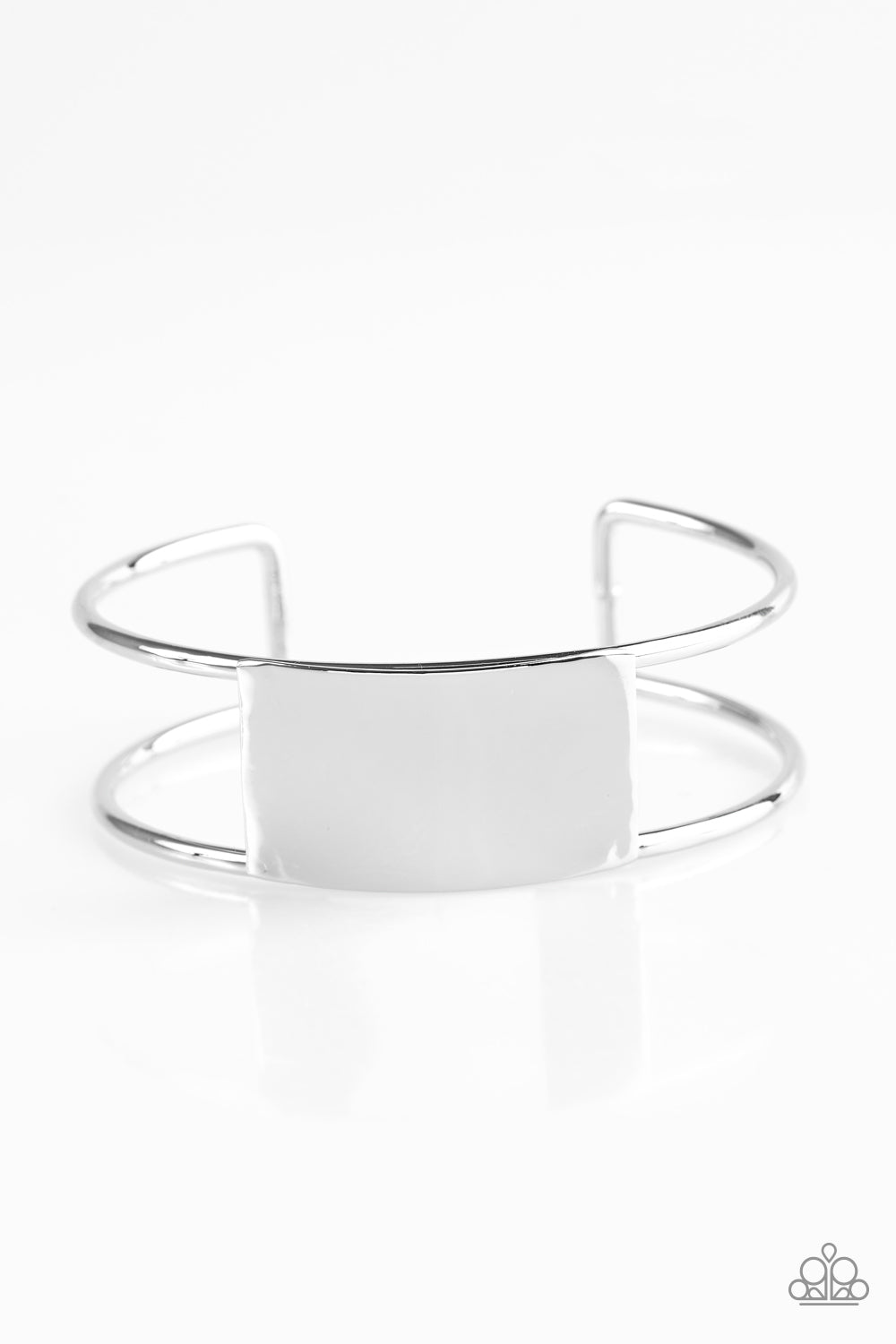 Glistening silver bars curl around the wrist, creating an airy cuff. Brushed in a high sheen finish, a shimmering silver frame adorns the center of the cuff for an edgy finish.