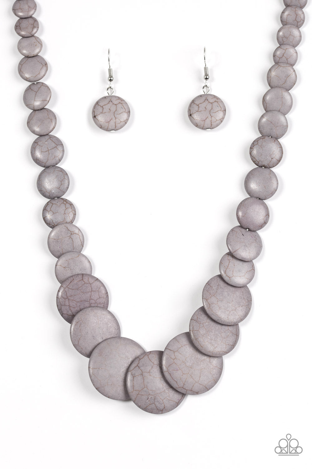 Gradually increasing in size, flat gray stones are threaded along a white thread, stacking below the collar for a refreshing artisanal look. Features an adjustable clasp closure.