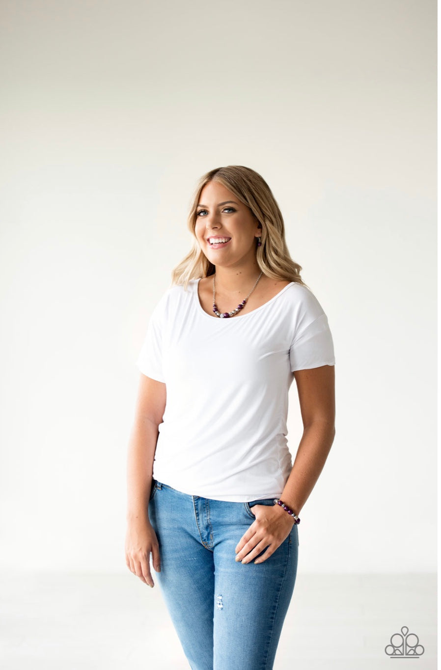 A collection of pearly purple, classic silver, and crystal-like hematite beads are threaded along an invisible wire below the collar for a glamorous look. Features an adjustable clasp closure.