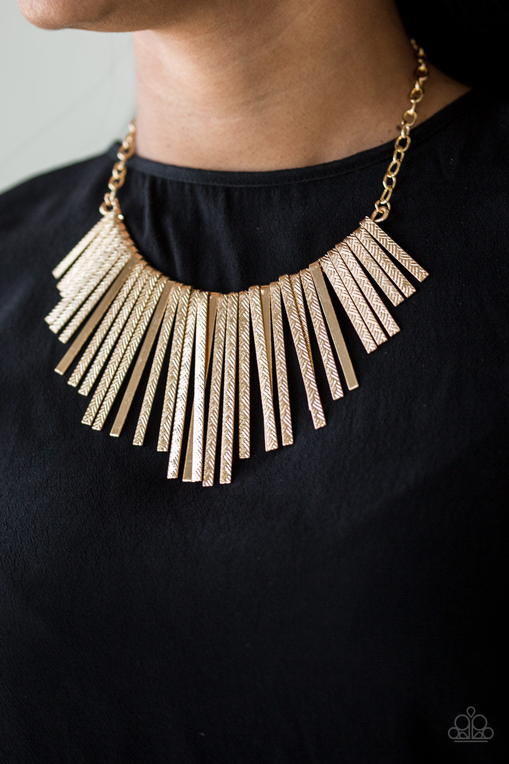Embossed in edgy linear patterns, flat gold rods alternate with plain gold rods below the collar, creating a fiercely tapered fringe. Features an adjustable clasp closure.